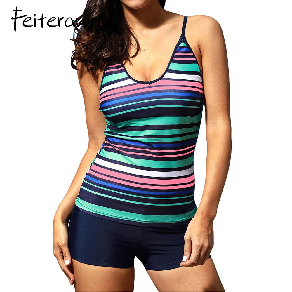 4.9 105 Video Reviews Feiterawn Women Two Piece Swimwear Bikinis 2017 SummerRainbow Stripes Swimdress Tankini And Shorts Swimsuit Beachwear DL410246 bikini-shorts-set
