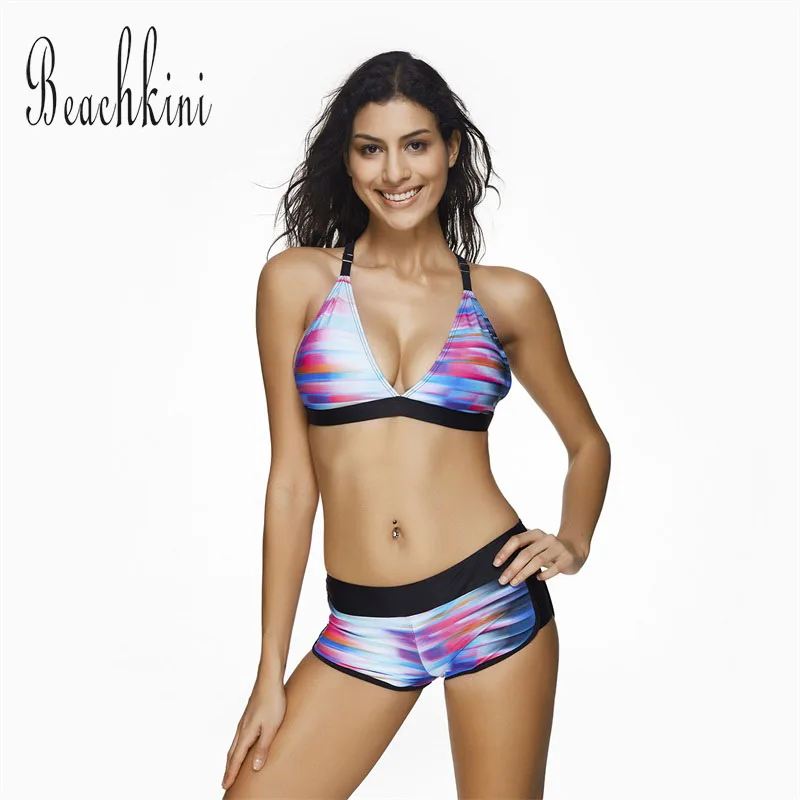 Gradient Color Bikini 2017 Adjustable Straps Two Pieces Swimwear Women Sexy Deep V Neck With Shorts Sport Style Swimsuit bikini-shorts-set
